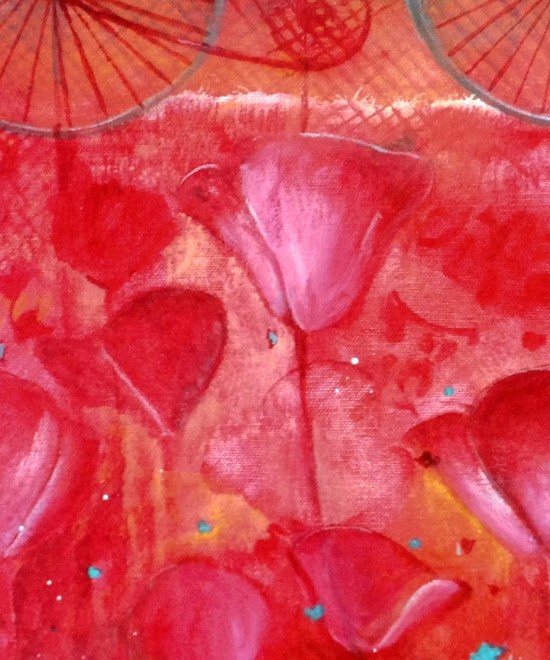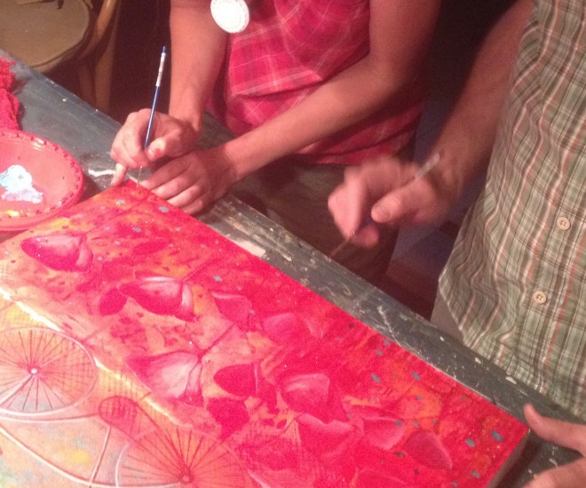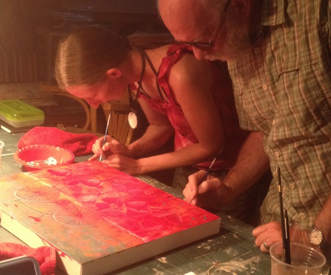 After that little tidbit of sage wisdom, we dove right in and painted together on a small canvas. Over the next few days of talking and painting and erasing and re-painting and hiding symbols and re-evaluating things and not very much yelling and even less spitting and cussing, we got back together yesterday and finished “Getaway Bike.”