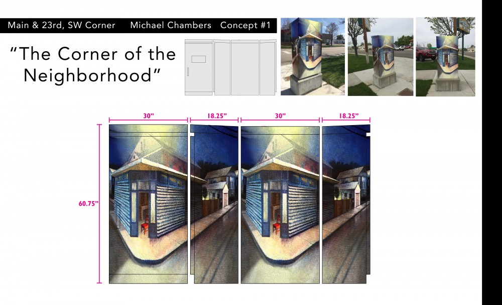 I’m thrilled and honored to be one of the artists selected this spring to design a traffic box skin for the City of Boise. This is my first public art commission. The box is located at the corner of Main and 23rd streets. It’s in a neighborhood that has a kind of mixed zoning, with small businesses and used car lots on the main drag (Main) and quiet streets and old houses behind. Melissa and I visited a couple times just recently to get a better feel for the place before I started my design. I submitted 3 concepts and this is the one chosen.