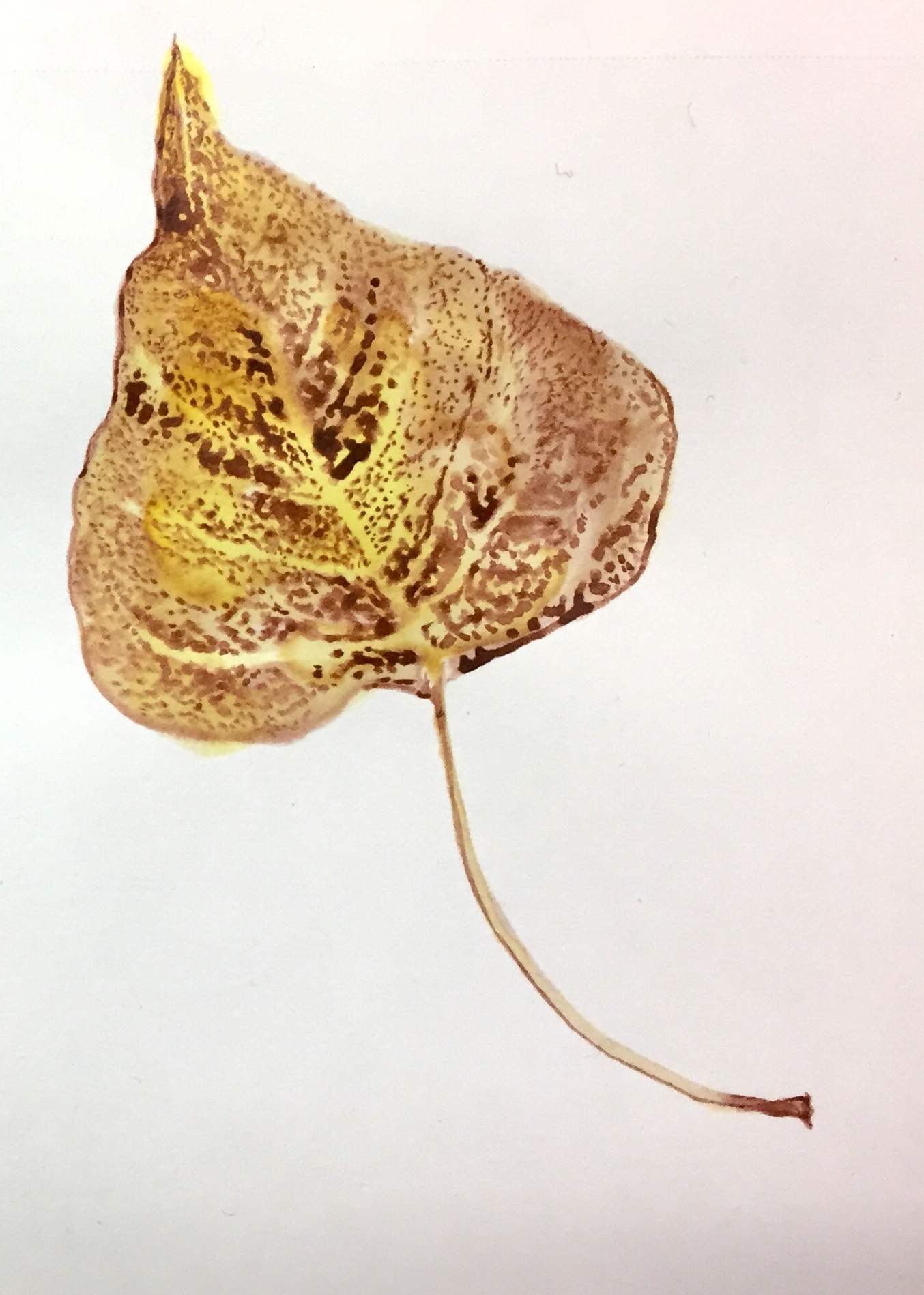 During the walk, I lagged behind the group with Lula and took photos of leaves and trees and couldn’t help but pick some of them up. Back at the VRBO’s kitchen table with my $1.79 watercolors and brush, the leaf motif tumbled out onto the paper.