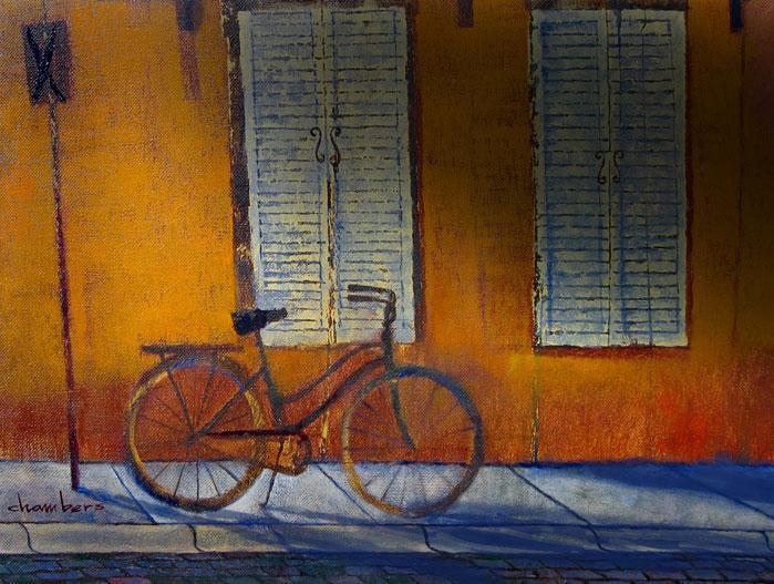 It’s starting to dawn on me that things are changing for the better. Finally. So I’m celebrating that with a painting of a bicycle casting morning shadows on a French Quarter sidewalk. We each have our own way of expressing hope, and bike portraits do it for me.