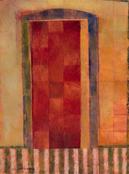 A red paneled door is shown slightly ajar in a blue and green casing with a decorative rounded header. The floor is impossibly vertical, but leads to the threshold. Enter if you want, but you may want to pause and consider. Or reconsider, as the case may be.