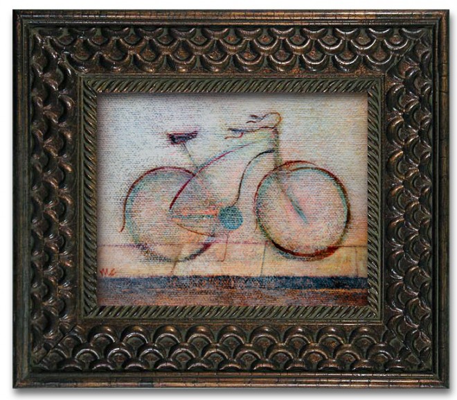 And why’s that? Well, it’s whimsical, loopy, drawy, patinaed, foggy, tiny, blue-inspired, rust-inspired, lit, glowy, scraped, worked and reworked, heroic, symmetrical but not obedient, contrasty, fakely framed, ambidextrous, pedal-less, elegant, spoke-less, exploiting the power of gray, scumbled, layered, oil-painted, evocative, impossible, sweet, tidy, extraordinary, stylized, informed in a naive kinda way, naive in an informed kinda way, swirly, silent and soulful, appealing, tender, coy, atmospheric, singular, bikey, and it leaves me wanting more, but not in a this-is-inadequate way, more of a I-like-ice-cream-so-I-would-like-another-scoop-please way.